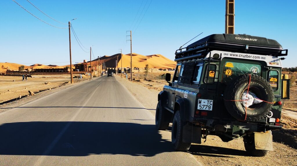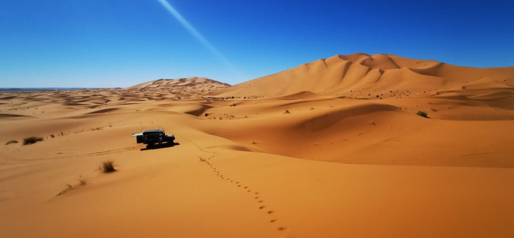 Explora las maravillas del desierto de Merzouga con nuestros todo terreno. La zona ofrece paisajes impresionantes y una gran cantidad de rutas y pistas accesibles para estos vehículos. Siempre y cuando nuestro vehículo esté correctamente preparado, podemos recorrer las innumerables dunas de arena de esta parte del desierto del Sahara.